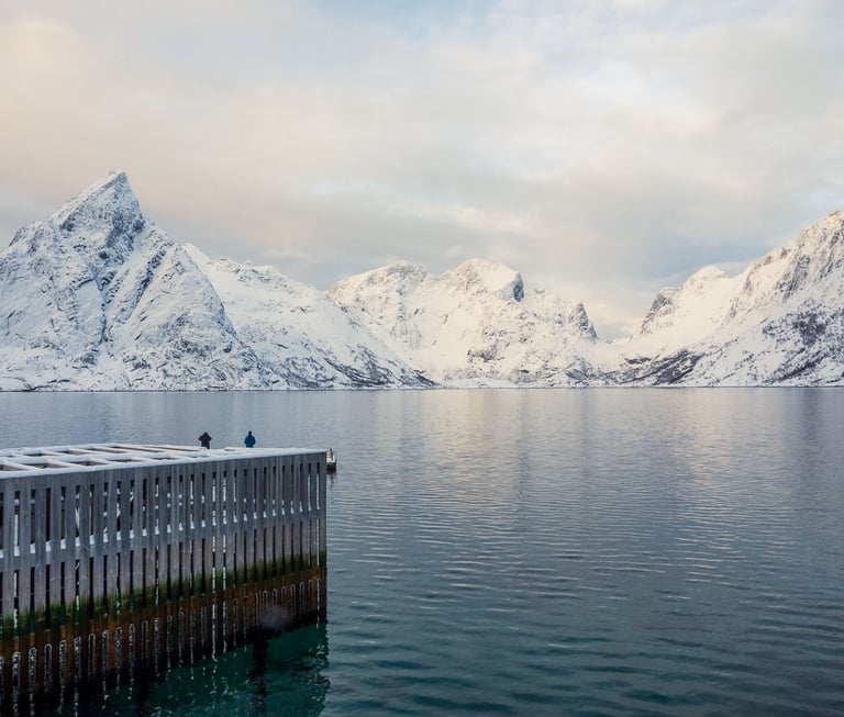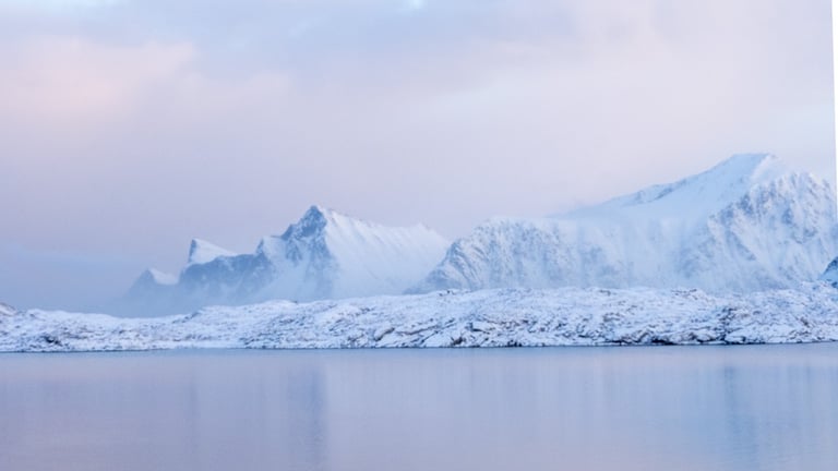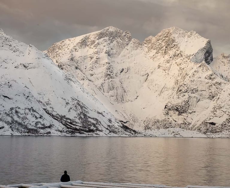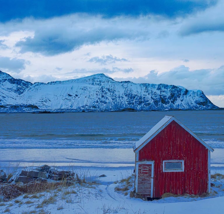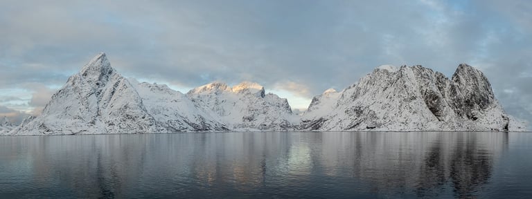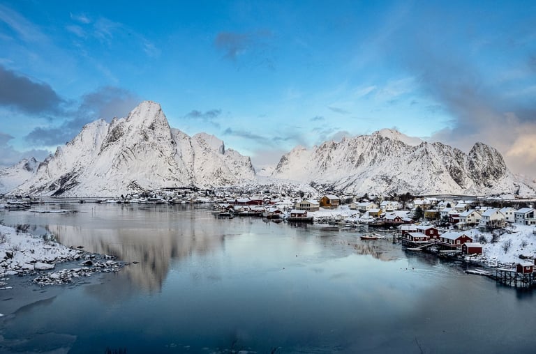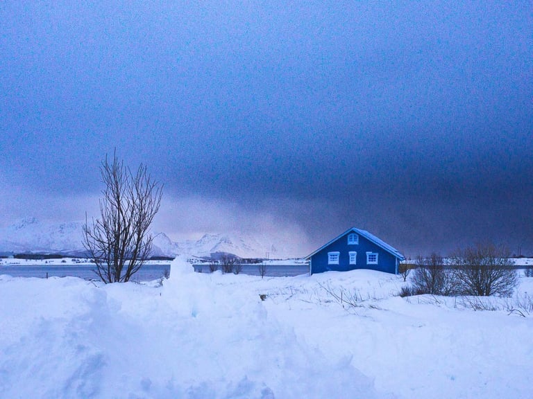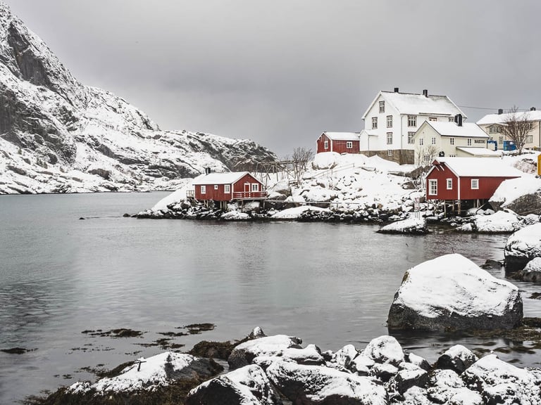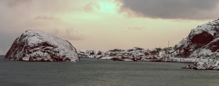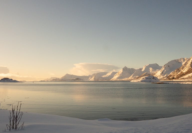 Le paysage hivernal des îles Lofoten en Norvège est tout simplement époustouflant. La neige recouvre majestueusement chaque recoin, créant une toile immaculée à perte de vue. Le ciel, d'un blanc éclatant, se décline en différentes nuances de blanc, allant des plus douces aux plus profondes. C'est un véritable spectacle pour les yeux, où la nature se pare de sa plus belle robe hivernale. Les montagnes et les fjords se fondent harmonieusement dans ce mélange de couleurs, créant une atmosphère sereine et féerique. Les contrastes entre le blanc de la neige, les nuances du ciel et les sommets escarpés offrent un paysage à couper le souffle, qui invite à la contemplation et à l'émerveillement. On ne peut qu'être subjugué par cette beauté naturelle si pure et si envoûtante.