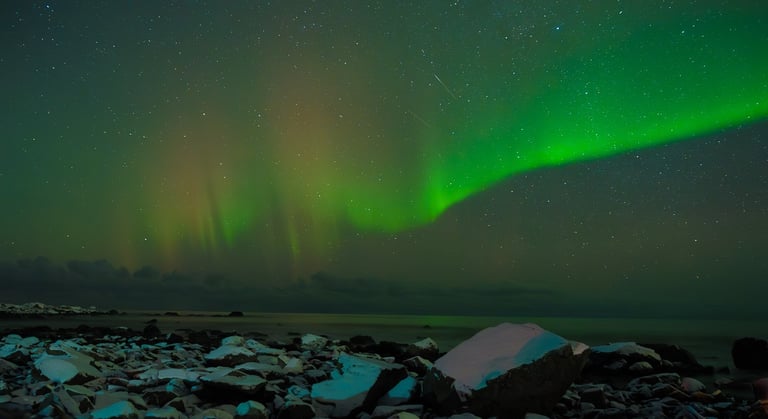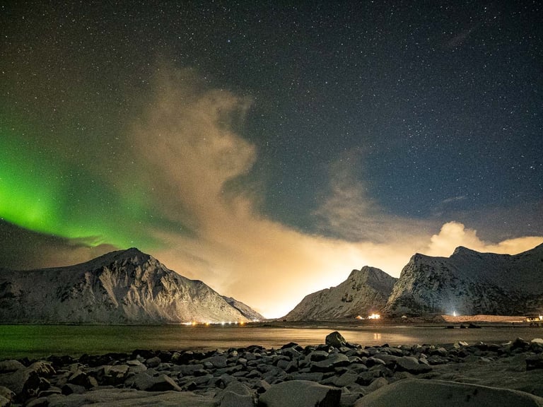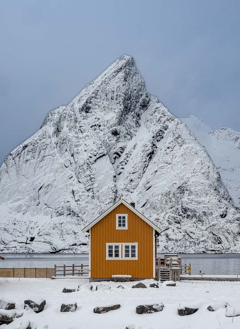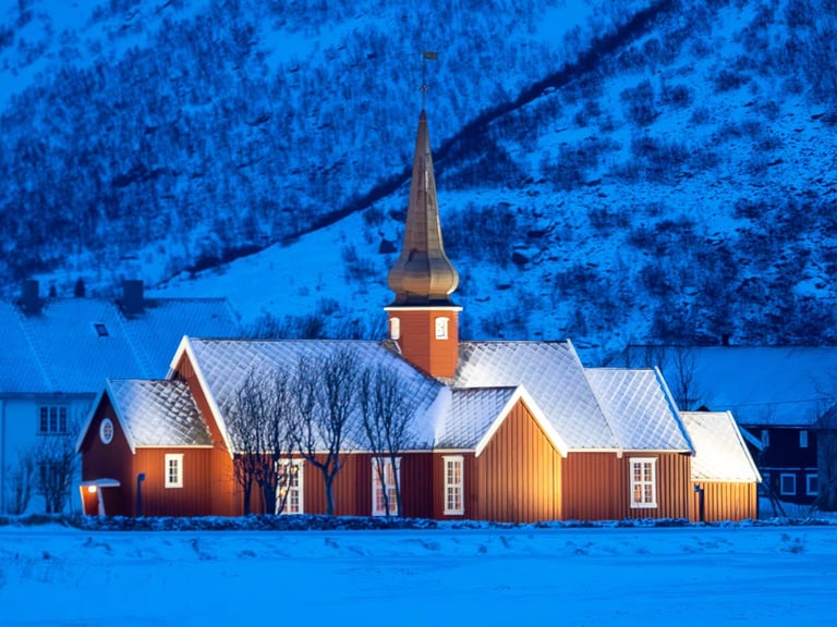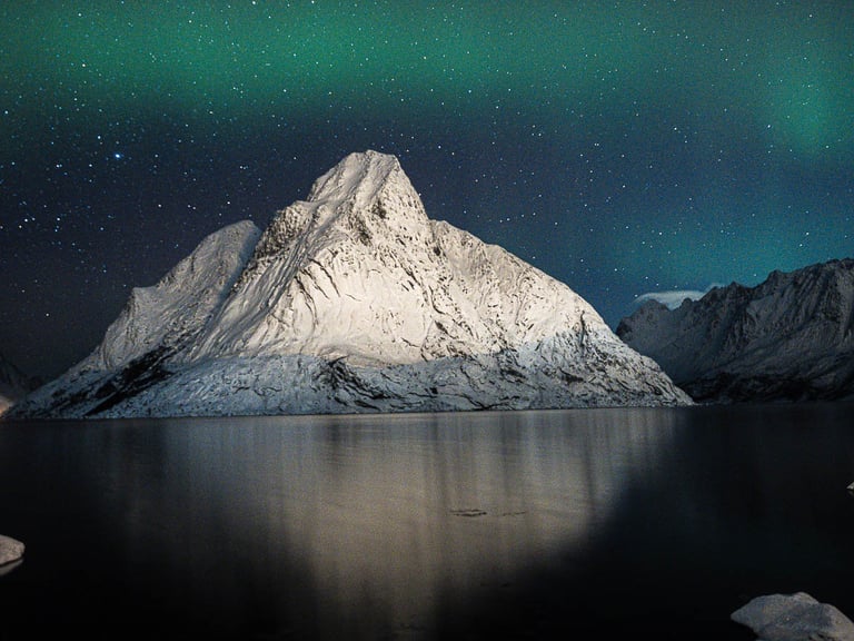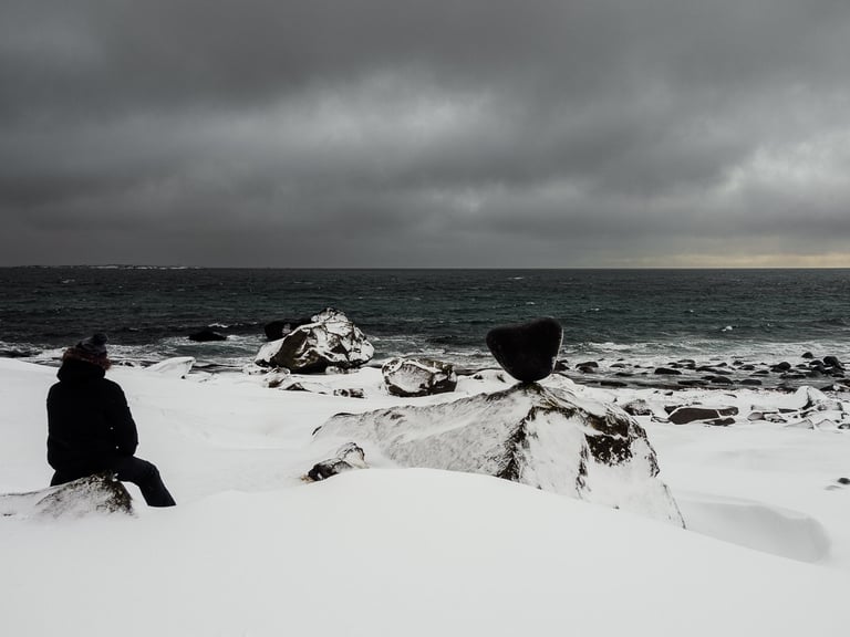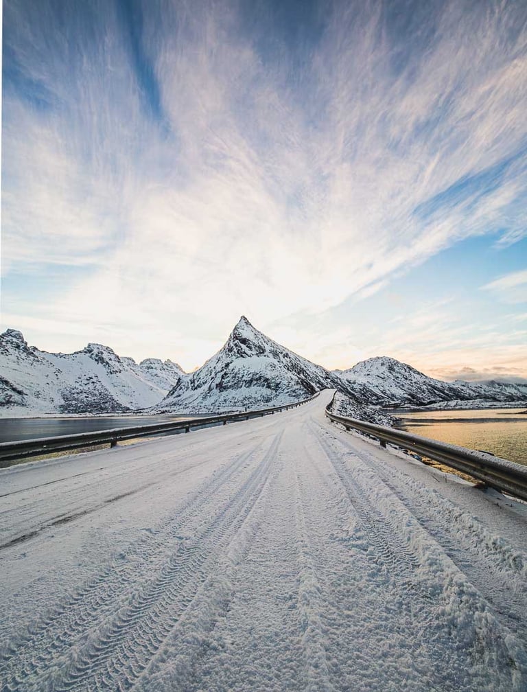 Le paysage hivernal des îles Lofoten en Norvège est tout simplement époustouflant. La neige recouvre majestueusement chaque recoin, créant une toile immaculée à perte de vue. Le ciel, d'un blanc éclatant, se décline en différentes nuances de blanc, allant des plus douces aux plus profondes. C'est un véritable spectacle pour les yeux, où la nature se pare de sa plus belle robe hivernale. Les montagnes et les fjords se fondent harmonieusement dans ce mélange de couleurs, créant une atmosphère sereine et féerique. Les contrastes entre le blanc de la neige, les nuances du ciel et les sommets escarpés offrent un paysage à couper le souffle, qui invite à la contemplation et à l'émerveillement. On ne peut qu'être subjugué par cette beauté naturelle si pure et si envoûtante.